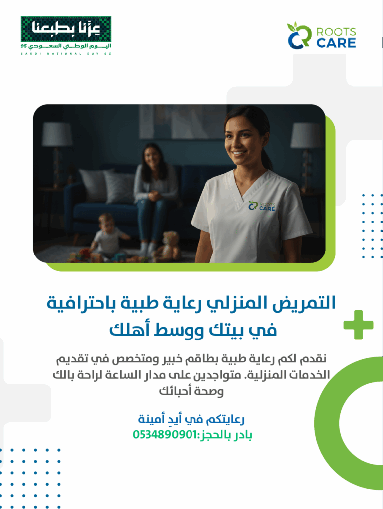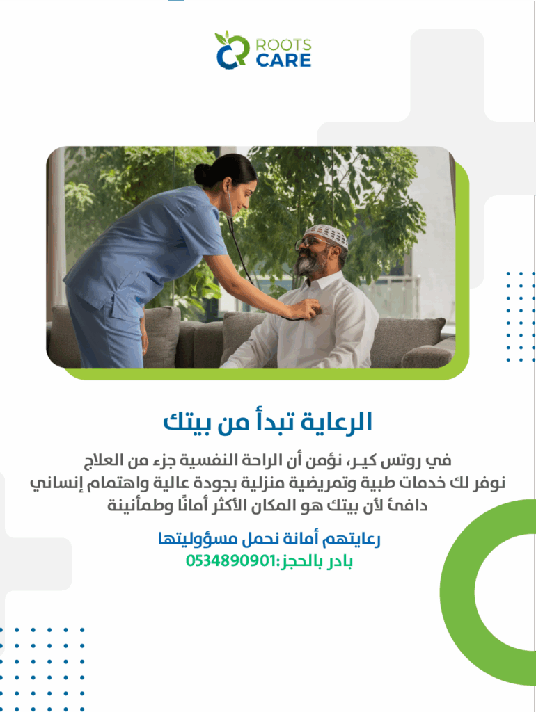 ولأننا نؤمن بأن جذور الرعاية تبدأ من الاهتمام الحقيقي، وتنمو بالعناية المستمرة، ونطمح لأن نكون الخيار الأول للمرضى وعائلاتهم في كل بيت بكل أمان وصحة وسلامة .
